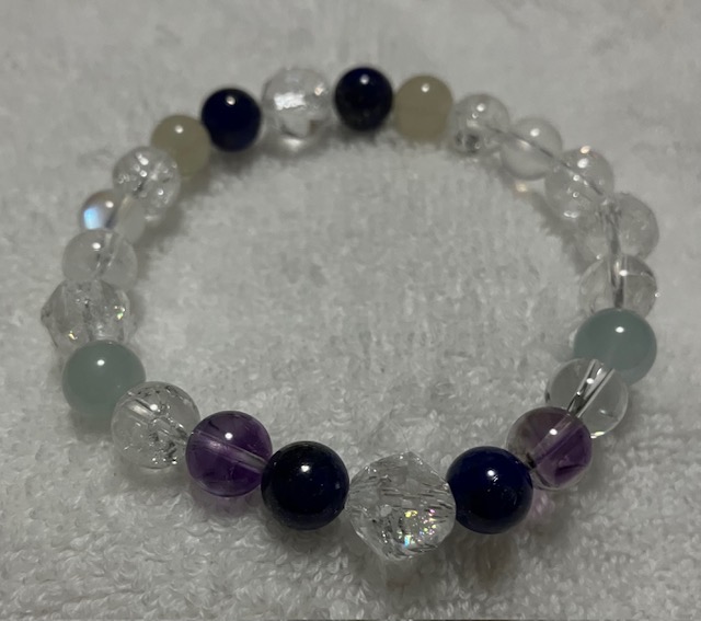 このブレスレットにはスーパーセブン、その名のとおり7つの鉱物が内包されている石(水晶、アメシスト、カコクセナイト、ゲーサイト、スモーキークォーツ、ルチル、レピドクロサイト)です。強力なヒーリング効果を持つ石として知られています。