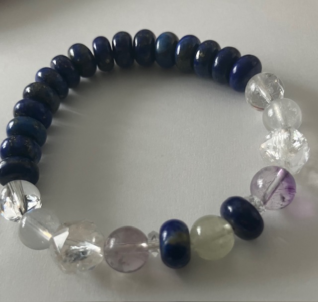 中央にリビアングラス、ラピス、スーパーセブン、虹入り水晶でまとめました。 ラピスは、厄除け、スーパーセブンやリビアングラスは自分自身の力を最大限に引き出す石として用いています。